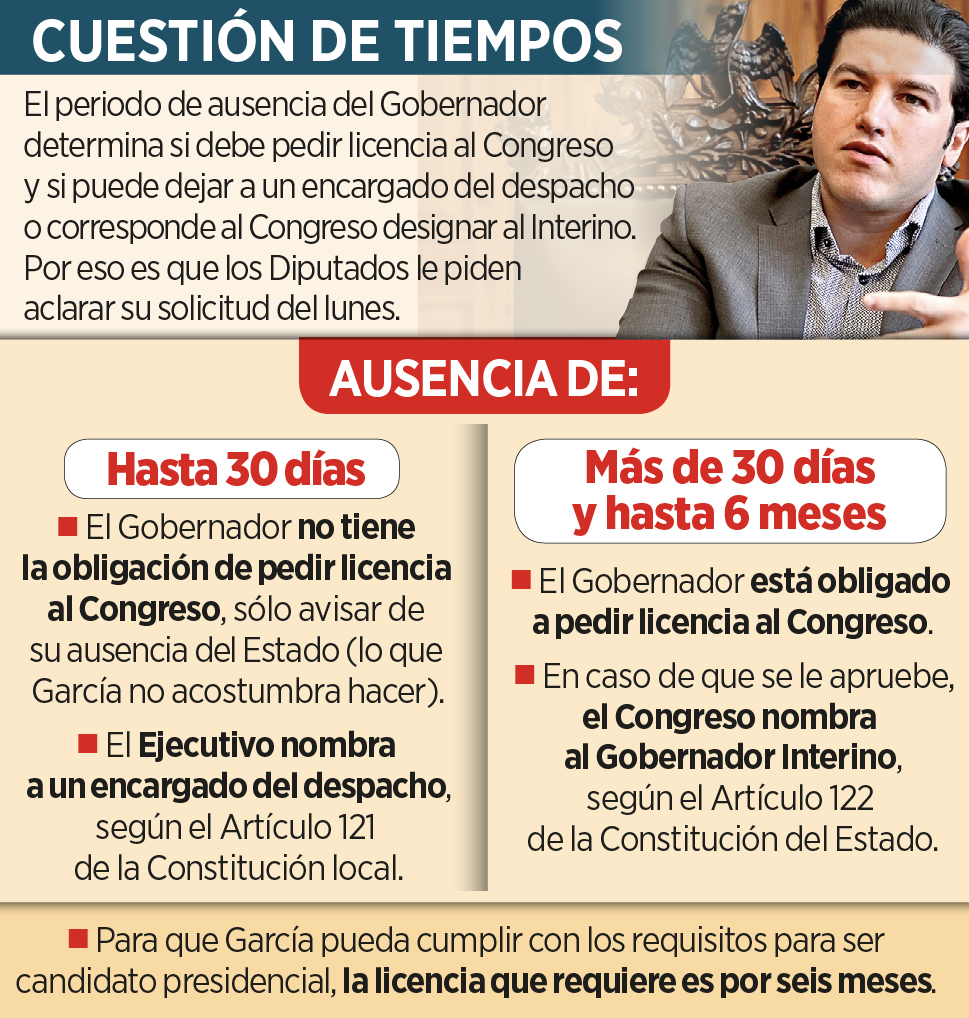 Ayer se publicó que, en la solicitud de licencia que García presentó el lunes con la intención de cumplir con los requisitos para contender por la Presidencia en 2024 por Movimiento Ciudadano, incluyó una «jugada legal» para tratar de imponer a quien se quedaría en su lugar en su ausencia y evitar que el Congreso lo defina.