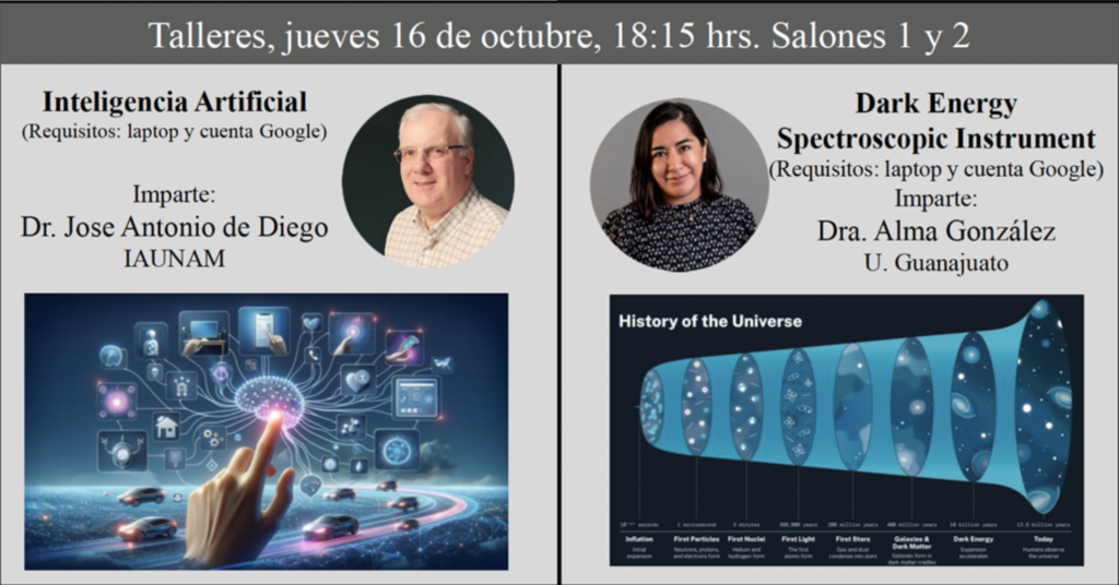 Otra actividad destacada será el taller de Inteligencia Artificial, “Dark Energy Spectroscopic Instrument”, impartido por la Dra. Alma González, de la Universidad de Guanajuato, donde se explorarán aplicaciones de IA en proyectos científicos avanzados.
