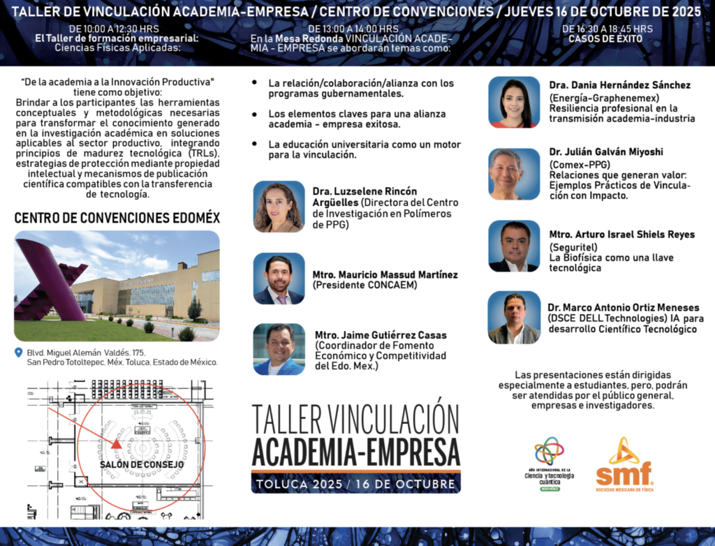 Dentro de las actividades más relevantes se encuentra el taller Vinculación Academia–Empresa, programado para el jueves 16 de octubre, que ofrecerá herramientas para transformar el conocimiento académico en soluciones aplicables al sector productivo. En este taller participarán la Dra. Dania Hernández Sánchez, Subdirectora de Materiales Grafénicos de Graphenemex, con la ponencia “Resiliencia profesional en la transición academia–industria”, y Amílcar Fernando Sala Arceo, Director Comercial de la empresa, quienes abordarán la integración de la investigación científica en aplicaciones tecnológicas y el desarrollo del sector productivo.